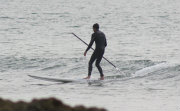 Standing on an extra big surf board, cruise on the flat for a workout or catch the waves.